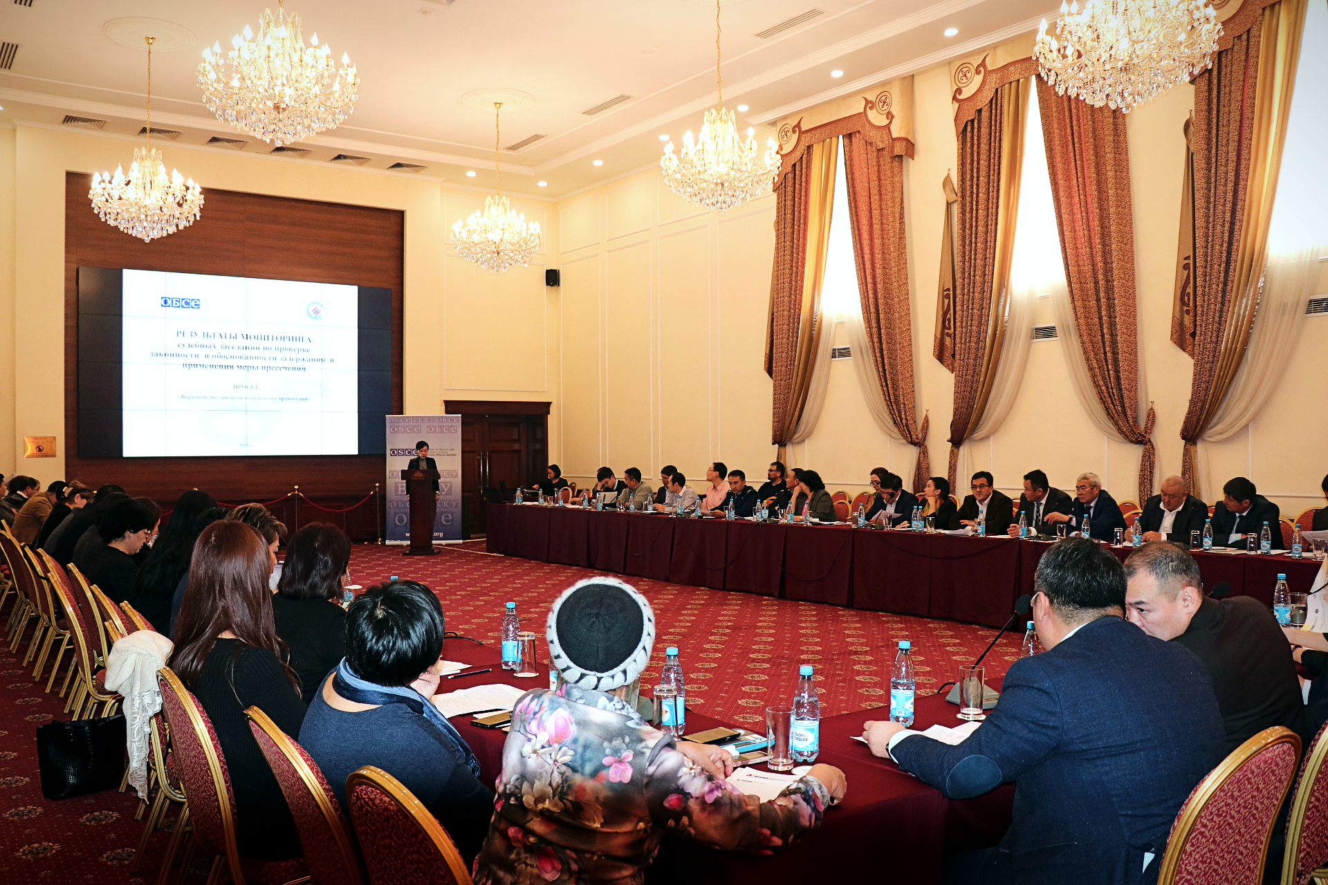 Investigating judges, prosecutors, attorneys and civil society representatives discuss the results of a trial monitoring at the round table on strengthening a human rights-oriented approach of investigating judges in criminal proceedings, Bihskek, 29 November 2019.