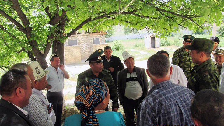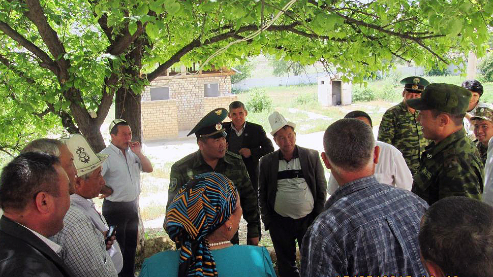 The Deputy Chairman of Kyrgyzstan's State Border Service Colonel Abdikarim Alimbaev instructs boarder outpost commander of Batken province during a meeting on early-warning and conflict-prevention mechanisms, Batken, 16 May 2015.