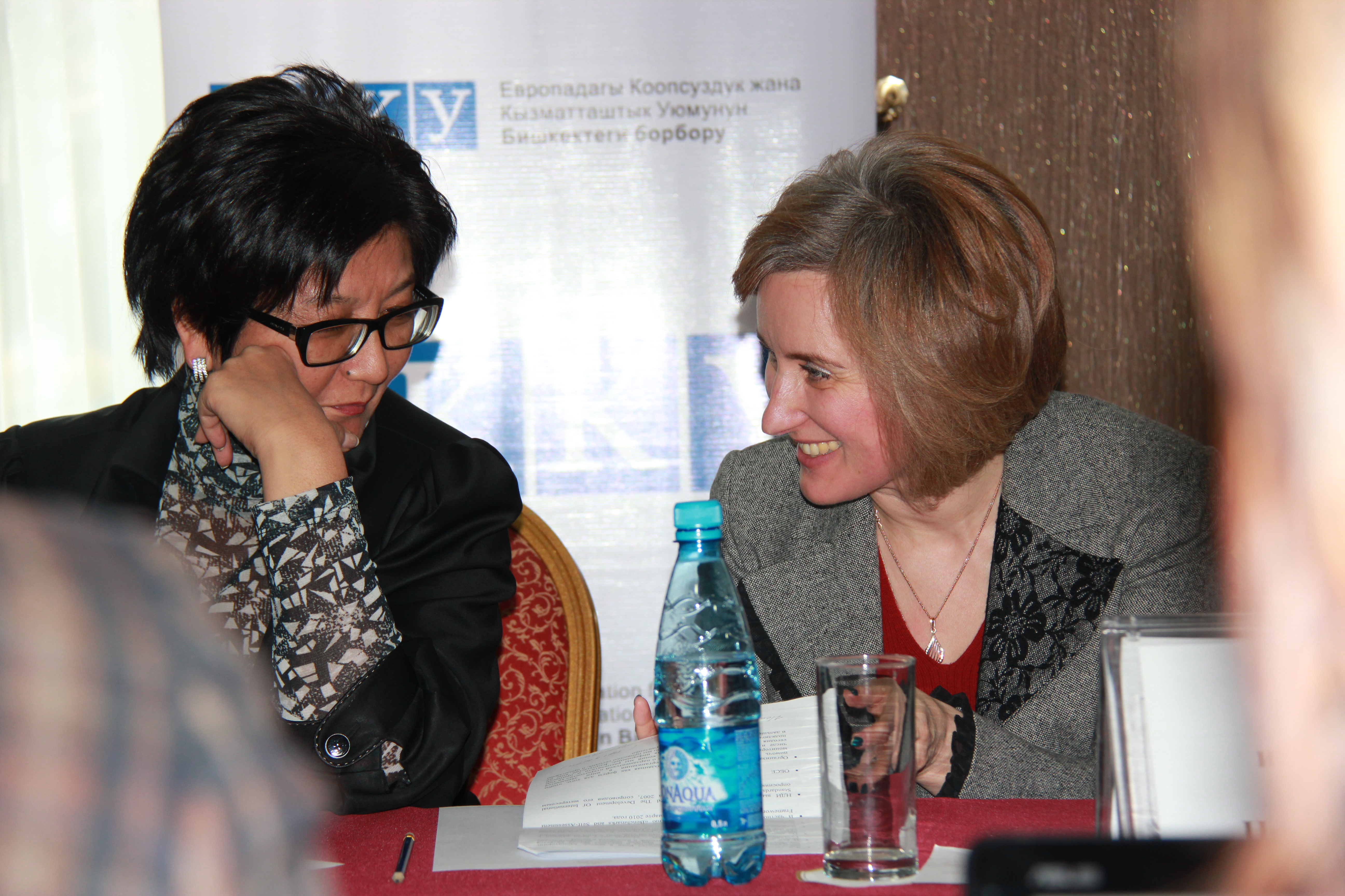 Taalaigul Isakunova, member of the Kyrgyz Parliament of sixth convocation (l) and Diana Digol, Institutional building Officer of the OSCE Centre in Bishkek at a roundtable discussion at the Kyrgyz Parliament monitoring, Bishkek, 18 December 2015.
