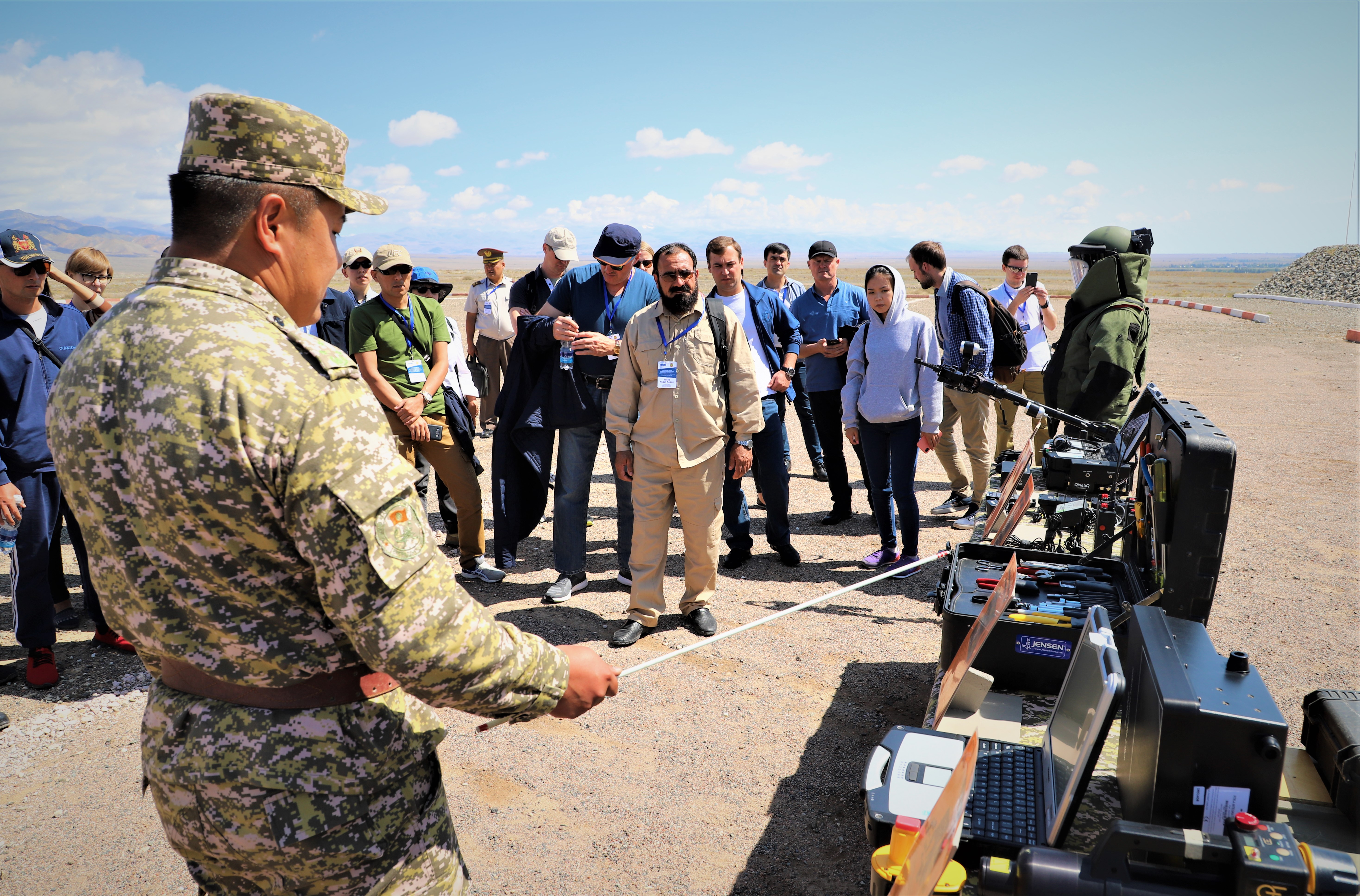 Участники 11-го ежегодного регионального практикума ОБСЕ на тему «Снижение риска использования взрывных устройств и меры реагирования: противодействие самодельным взрывным устройствам (СВУ)» во время практической демонстрации оборудования для обнаружения и подрыва самодельных взрывных устройств, проводимой Генеральным штабом Вооруженных Сил Кыргызстана и Международным трастовым фондом повышения безопасности человека, Иссык-Куль, Кыргызстан, 19 августа 2019 года.