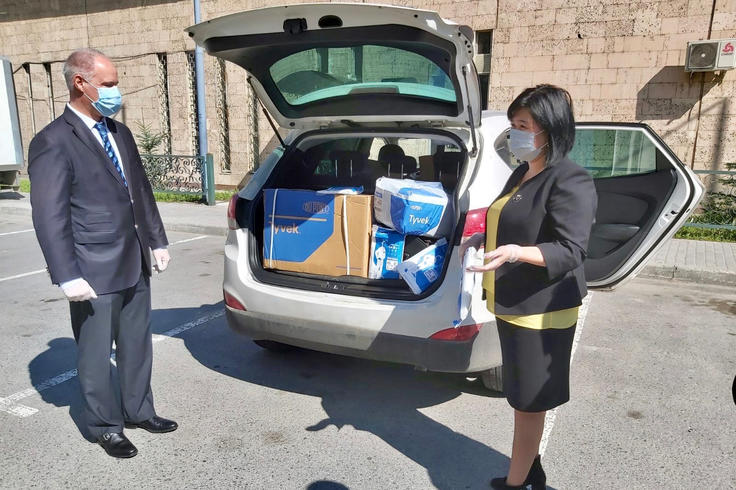 Pierre von Arx, Head of the OSCE Programme Office in Bishkek and Aziza Soltonbekova, Deputy Minister of Labour and Social Development, during the handover of the personal protective equipment as part of the Office's assistance to the Government during the COVID-19 pandemic.