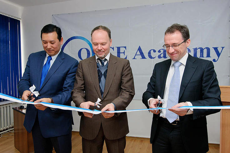 L-r: Director of the Department of International Organizations and Security of Kyrgyzstan’s Foreign Ministry Ulan Djusupov, the Deputy Head of the OSCE Centre in Bishkek Anders Troedsson, the Director of the OSCE Academy Maxim Ryabkov, at the opening of the second new Master of Arts in Economic Governance and Development Programme, Bishkek, 16 January 2012.
