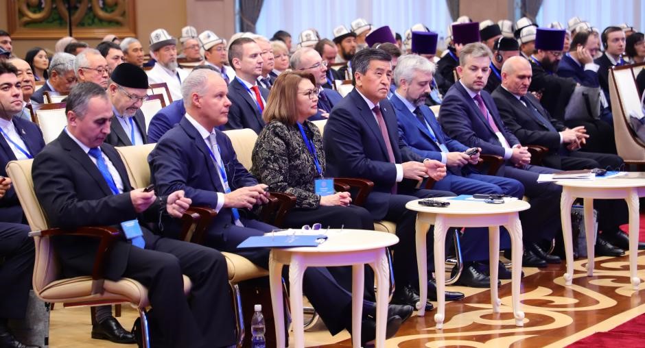 Пьер фон Аркс, глава Программного офиса ОБСЕ в Бишкеке, Президент Кыргызской Республики Сооронбай Жээнбеков и вице-премьер-министр Кыргызской Республики Алтынай Омурбекова на Международной конференции «Ислам и православие — религии мира», Бишкек, 22 ноября 2019 года. (ОБСЕ/Чынгыз Жаныбеков)