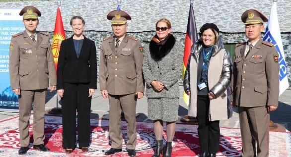 Участники церемонии в честь вывоза последней партии меланжа, компонента ракетного топлива, из района Новопавловки и Чуйской долины. Бишкек, Кыргызстан, 2 ноября 2021 года. (Программный офис ОБСЕ в Бишкеке)
